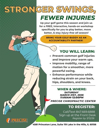 Do you get stiff, achy or have pain before, during or after golf? This hands on Workshop is for you! You will learn ways to keep yourself pain free from golf and have massive take aways on how to improve your game as a whole! Longer drives sound nice? More consistent and accurate shots sound nice? All possible if you attend! Free to attend with guest as well. Call 847-669-6888 to register! Spots are limited!