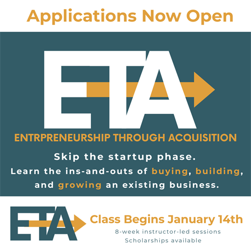 Applications are now open for Entrepreneurship Through Acquisition cohort 4! Ready to own a business without starting from scratch? Join ETA’s 8-week, instructor-led program and learn how to find, evaluate, and acquire an existing business. No business ownership experience is needed to participate.