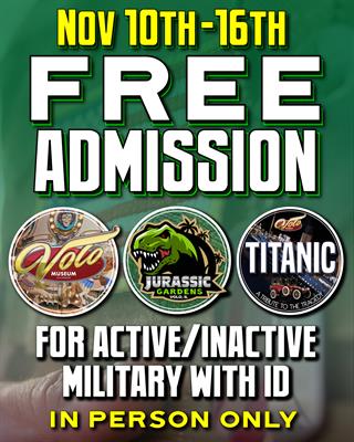 We offer military discounts every day, but for the entire week of Veterans Day, we wanted to honor all who have served by offering them FREE Platinum Passes, (which includes admission to Volo Museum, Jurassic Gardens, Titanic Museum, Crime and Punishment Sideshow and Military Combat Zone) to all active and inactive military with a valid ID.