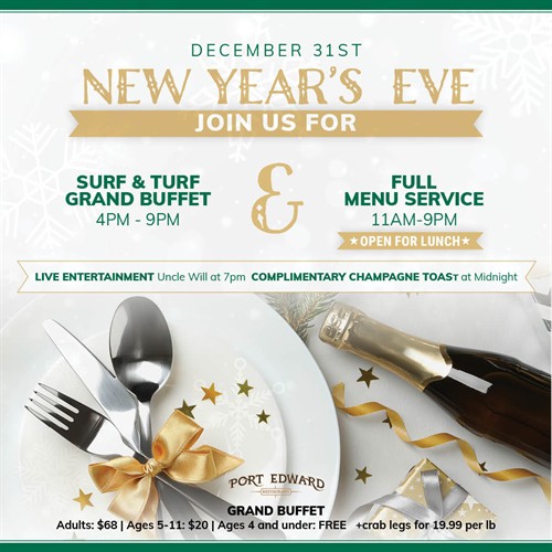 Our New Year’s Eve Grand Buffet returns with an incredible spread, live entertainment from Uncle Will at 7pm, and a complimentary champagne toast at midnight.