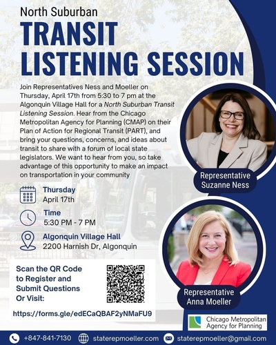 State Representative Anna Moeller and I will be hosting a North Suburban Transit Listening Session Thursday, April 17th from 5:30 p.m. to 7:00 p.m. at Algonquin Village Hall (2200 Harnish Drive, Algonquin).