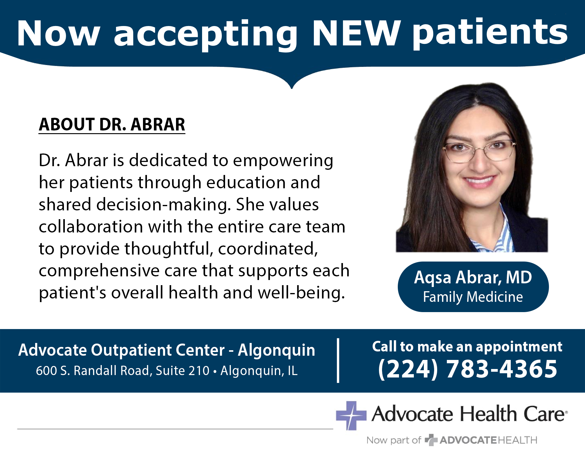 Welcome Doctor Abrar to the Advocate Outpatient Center - Algonquin Now accepting NEW patients!About Dr. Abrar Dr. Abrar is dedicated to empowering her patients through education and shared decision-making. She values collaboration with the entire care team to provide thoughtful, coordinated, comprehensive care that supports each patient's overall health and well-being.   Advocate ...read more